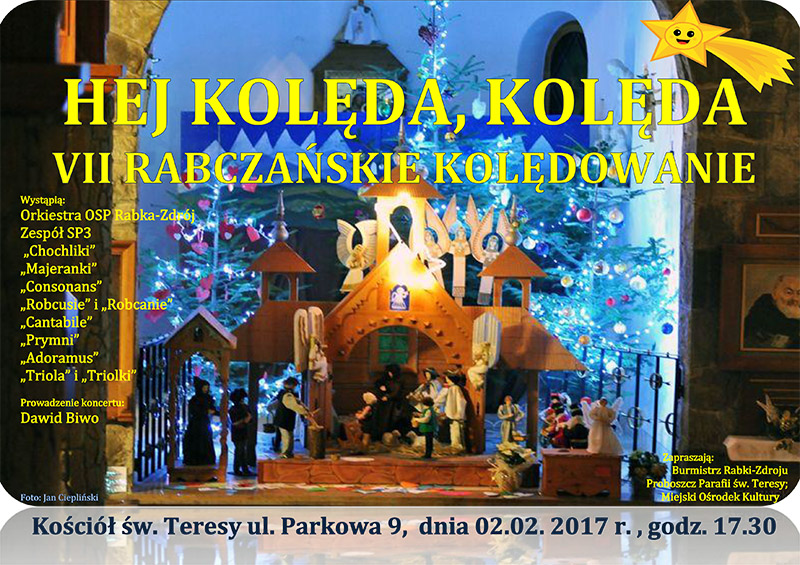 Burmistrz Rabki-Zdroju Ewa Przybyło, proboszcz parafii Św. Teresy ks. Dariusz Pacula i Miejski Ośrodek Kultury gorąco zapraszają wszystkich rabczan, turystów i kuracjuszy na VII Rabczańskie Kolędowanie pt. „Hej kolęda, kolęda...”, które odbędzie się w czwartek 2 lutego o godzinie 17.30 w kościele św. Teresy. Przed zgromadzoną publicznością wystąpią: Zespoły Regionalne: Majeranki, Prymni, Robcusie i Robcanie; Chóry: Adoramus, Cantabile, Chochliki; Zespoły: Triola i Triolki, Consonans, Zespół Wokalno-Instrumentalny ze SP nr 3 i Orkiestra Dęta OSP. Prowadzenie koncertu: Dawid Biwo.